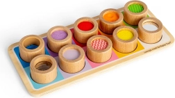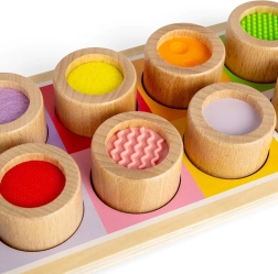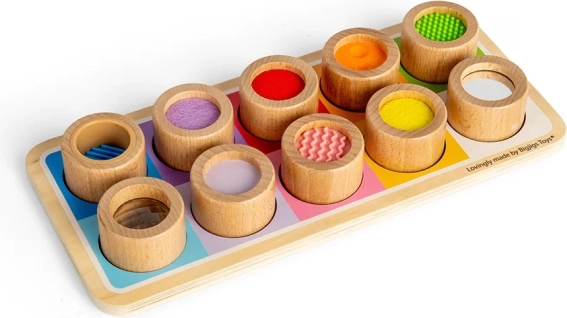 Táto úžasná senzorická doska je ideálnym spôsobom, ako deti zoznámiť s rôznymi textúrami a farbami. Obsahuje drevenú dosku s farebnými otvormi a jedenásť vkladajúcich dielikov, z ktorých každý má jedinečnú povrchovú úpravu, od vrúbkovaného silikónu po jemnú plsť. Táto hračka nielenže pomôže rozlišovať rôzne textúry, ale tiež podporuje koordináciu rúk a očí.