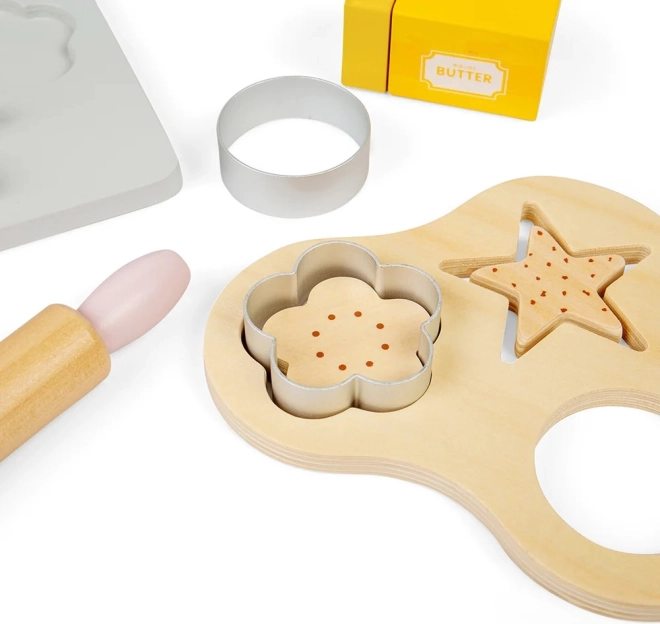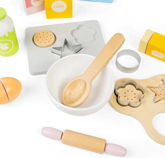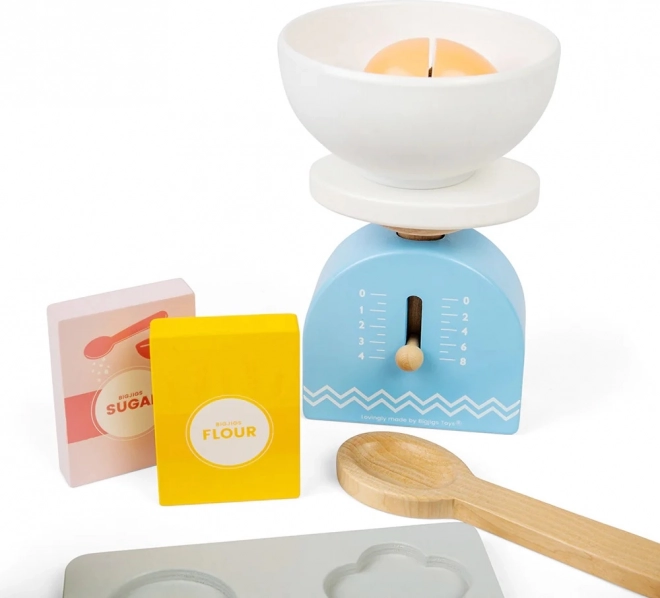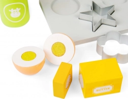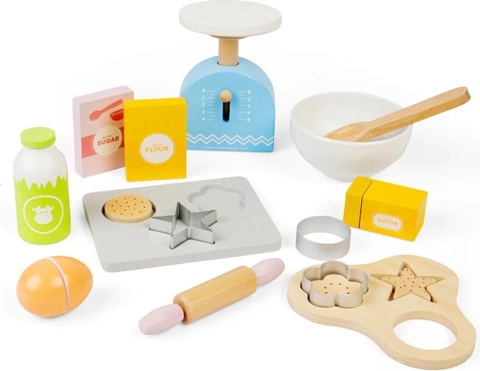 S touto detskou drevenou sadou na pečenie môžete deťom priniesť hodiny zábavy a zároveň podporiť ich predstavivosť. Sada obsahuje drevený plech na pečenie, váhu, vykrajovátka, valček, misu, maslo, vajcia, múku, cukor a mlieko. Bezpečnosť v kuchyni sa naučia hravo a zábavne.