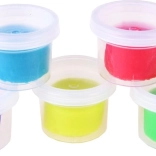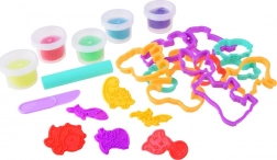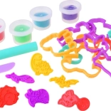 Štyri kelímky farebnej plastelíny, valček a množstvo plastových vykrajovačiek pre nekonečné nápady a zábavu.