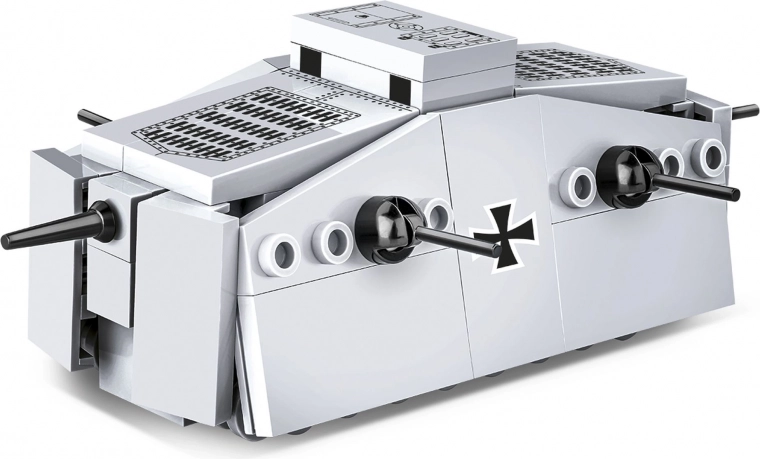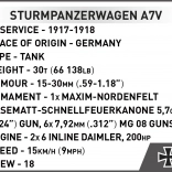 Sturmpanzerwagen A7V bol prvý nemecký tank nasadený na konci prvej svetovej vojny. Tento ikonický obrnenec s posádkou až 18 vojakov niesol 57 mm kanón Nordfeld a šesť guľometov MG 08. Model od COBI v mierke 1:72 s dĺžkou cca 11,5 cm zachováva typické rysy originálu a zaujme precíznymi potlačami krížov, mriežok a poklopov.