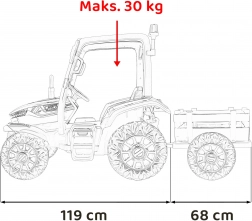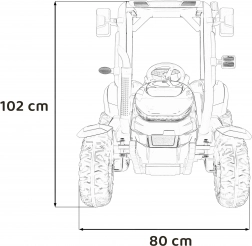 Perfektné rozmery vozidla aj s prívesom: dĺžka 187 cm, šírka 80 cm, výška 102 cm. Samotné vozidlo meria dĺžka 119 cm, šírka 80 cm, výška 102 cm. Maximálne zaťaženie traktora je 30 kg, čo zaručuje širokú použiteľnosť tohto hračkárskeho vozidla.