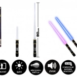 Meč má dĺžku 80 cm a ľahko ho zložíte na prenášanie či uloženie. Integrované senzory zabezpečujú zvuky pri pohybe a tiež zvuk pri zásahu cieľa. Napájanie zabezpečujú 3× AAA batérie, ktoré sú už súčasťou balenia – môžete začať hrať hneď po rozbalení.