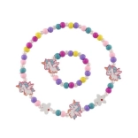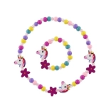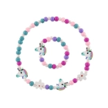 Táto hravá sada detského šperku – náhrdelník a náramok – očarí veselými farbami, korálikmi a príveskami s motívom jednorožcov a kvetín. Kombinácia dreva a plastu je ľahká, príjemná na dotyk a vhodná na každodenné nosenie.