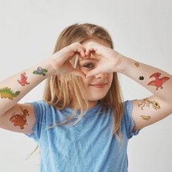 Objavte kolekciu dočasných tetovaní s obľúbenými dinosaurami. Deti si môžu vybrať svoj obľúbený motív a behom chvíľky sa premeniť na dinoexpertov. Tetovania sa ľahko aplikujú aj odstraňujú a sú skvelé na detské oslavy, tábory alebo ako malá pozornosť.