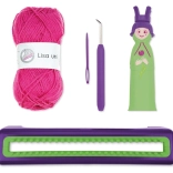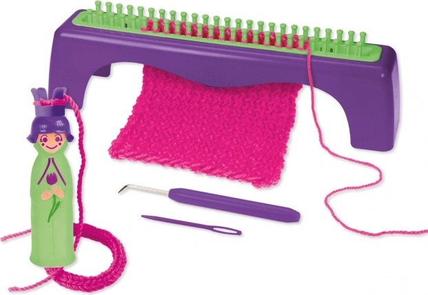 - Kompletná výbava: pletacia bábika, pletací stôl, háčik, plastová ihla a priadza