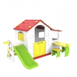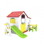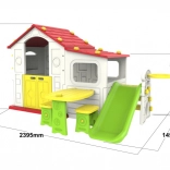 Rozmery záhradného domčeka: Výška 128 cm, celková dĺžka 239,5 cm, a šírka domčeka 108 cm, čo umožňuje dostatok priestoru pre deti rôznych vekových kategórií.