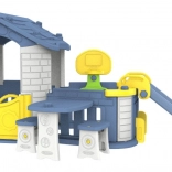 Domček obsahuje šmykľavku, basketbalový kôš a ďalšie herné prvky, ktoré podporujú fyzickú aktivitu a kreativitu detí.