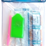 - Obrázok s lepiacou vrstvou, aplikačné pero, vosk, miska na kamienky, sada farebných kamienkov, stojan