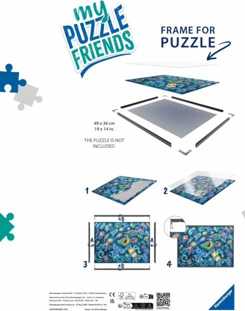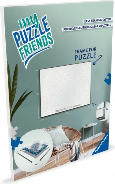 Čierny plastový rám Ravensburger ponúka možnosť zarámovať až do maximálnej veľkosti 500 dielikov, čo umožňuje flexibilné použitie pre rôzne veľkosti. Rám sa dá zavesiť na výšku aj na šírku, čo zabezpečuje univerzálne využitie. Puzzle môžete jednoducho zložiť priamo na priloženú zadnú kartónovú dosku, a potom ju zafixovať pomocou priloženého plexiskla.