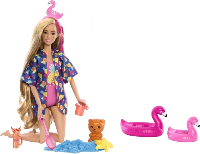 Set prináša mix módy, pláže a zmyslového objavovania: tvarovací piesok s lopatkou, vedierkom a formičkou rozvíja tvorivosť, zatiaľ čo plameniakové doplnky a plavky s ovocným motívom podčiarkujú letnú atmosféru. Ideálny darček pre deti od 3 rokov, ktoré milujú prekvapenia a imaginatívnu hru.