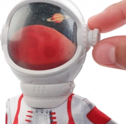 Detailný astronautický oblek s potlačenými prvkami, striebornými rukavicami a čiernymi topánkami dopĺňa prilba s čírym štítom pre autentické kozmické príbehy.
