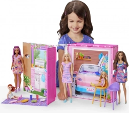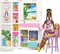 Súčasťou je bábika BARBIE a 11 štýlových doplnkov – riad, 2 stoličky, uteráčik či dečka – ktoré ozdobia interiér a prinesú do hry nové nápady. Grafické motívy, napríklad triedenie odpadu, rastliny, solárne panely na streche alebo elektrické auto, nenápadne učia deti o ekológii.