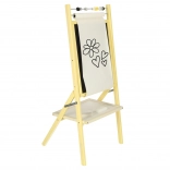 Súčasťou je tiež rolka papiera pre veľké výtvory, farebné magnety, fixka, 3× krieda a hubka. Stabilná drevená konštrukcia a odkladacia polica udržia všetko po ruke a zaistia pohodlné používanie.