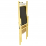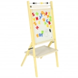 Táto stojaca tabuľa rozvíja fantáziu aj zručnosti detí – od prvého písania a kreslenia až po učenie čísel a písmen. Vďaka dvom stranám ponúka viac spôsobov hry: na magnetickej bielej strane možno písať fixkou a skladať slová z magnetických písmen, čierna kriedová strana je ideálna na rýchle skice aj školu nanečisto.