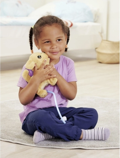 - Bezpečná hračka pre najmenších – šteniatko je veľké 20 cm, má veľké vyšívané čierne oči a plastový nos. Je oblečené do pršiplášťa. Funguje na batérie (sú súčasťou balenia).