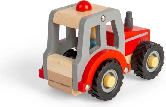 Traktor je vyrobený z kombinácie prírodného dreva, červeného a šedého laku, takže priťahuje pozornosť a zaujme malých objaviteľov.