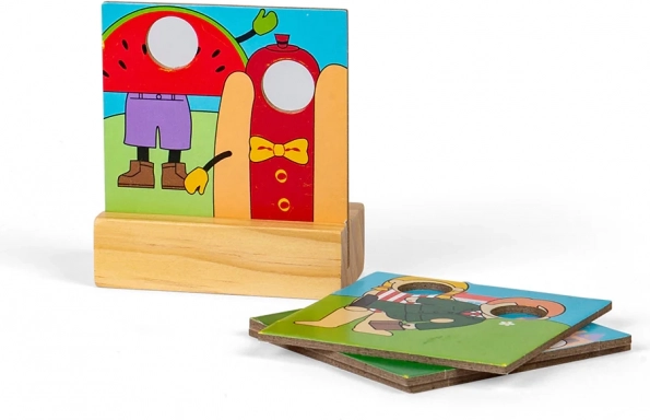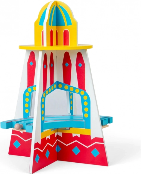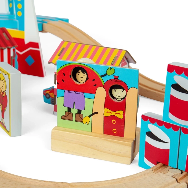 Táto drevená vláčkodráha s motívom zábavnej pouťe obsahuje všetko potrebné k tomu, aby ste sa ponorili do svetov plných zábavy a radosti. Deti môžu prejsť vlakom okolo cirkusového stanija, chytať kačičky alebo sa fotiť s vtipnými foto zásadnými scénami. Set zahŕňa: