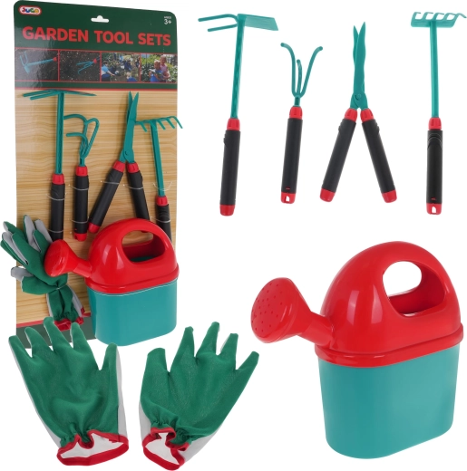 - rukavice cca 21,5 cm x 12,5 cm, šírka v hornej časti 7,5 cm až 10,5 cm, prsty cca 6 cm dlhé, - veľká krhla s rozmermi cca 22 cm x 19,5 cm x 8 cm, - motyčka cca 26,5 cm x 10,5 cm x 4,5 cm, - ručný kultivátor cca 21 cm x 5,5 cm x 5 cm, - nožnice s rozmermi cca 24 cm x 9 cm x 2 cm, - hrable cca 26 cm x 6,5 cm x 5 cm, - obal cca 28 cm x 58 cm x 8 cm. |