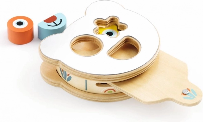 Zábavná drevená vkladačka Djeco pomáha deťom rozpoznávať tvary a farby. Dieťa vkladá 3 geometrické dieliky do správnych otvorov, aby vytvorilo tvár medvedíka, a potom za jazykom medvedíka kúzelne „schová“ tvary. Rozvoj jemnej motoriky, učenie tvarov a farieb a zábavná interaktívna hra pre deti od 18 mesiacov.