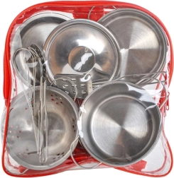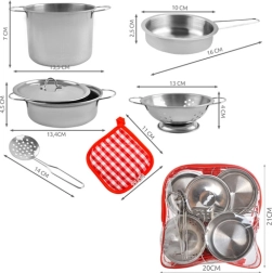Tento realistický kovový set hrncov a náradia je ideálny pre detské kuchynky a hranie na domácnosť, bistro alebo reštauráciu. Klasický strieborný vzhľad skvelo ladí s každým detským kútikom a univerzálna pokrievka pasuje na všetky hrnce. Vďaka ľahkej konštrukcii a kompaktným rozmerom sa celý set ľahko prenáša a ukladá.