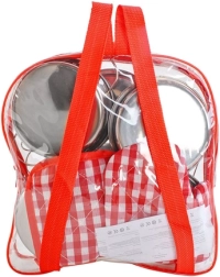 Kompletná kuchynská sada pre malých kuchárov s celkom 13 dielmi v praktickom priehľadnom batôžku. Obsahuje kovové hrnce, panvicu, cedidlo, univerzálnu pokrievku a sadu náradia doplnenú o textilnú chňapku a podložku. Ľahký, prenosný a odolný set podporuje kreativitu, motoriku a spoločenskú hru detí.