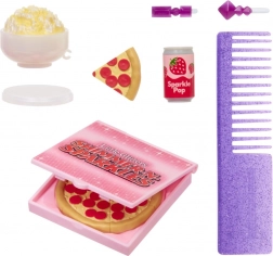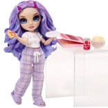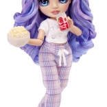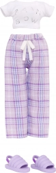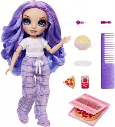Violet má pohodlné fialové kockované pyžamo, mäkké papuče a sadu občerstvenia – pizzu, popcorn, tanier a nápoj. Ideálne na tematické scenky a pyžamové párty.