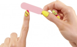 Pilník, 2 sady samolepiacich a znovu snímateľných nechtov, trblietky a 2 „lakové“ fľaštičky podporujú fantáziu a jemnú motoriku.