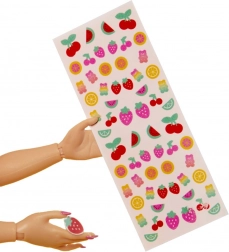 Vo vnútri čaká viac než 15 prekvapení: šik outfit, topánky, šperky, stojan na bábiku a doplnky pre nechtový salón – pilník, 2 sady samolepiacich a znovu snímateľných nechtov, trblietky aj 2 fľaštičky „laku“. To všetko v hravom ovocnom štýle, ktorý podnecuje kreativitu a rozvíja jemnú motoriku.