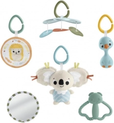 - Hracia deka s oblúkom, plyšová koala so zvončekom, kolotoč na pripnutie na kočík, zrkadielko, hrkálka‑husa, hryzátko‑mora (bez BPA), šuštiaca hračka