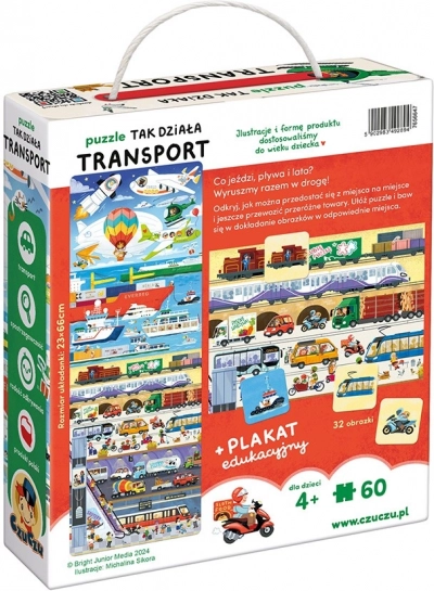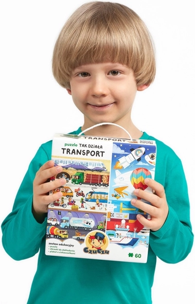 Puzzle Takto funguje doprava je jedinečná vzdelávacia sada pre predškolské deti, najmä ak majú rady rôzne vozidlá. Skladá sa zo 60-dielnej skladačky, 32 zodpovedajúcich obrázkov a vzdelávacieho plagátu. Poďme sa zabávať! Venuj pozornosť tomu, čo jazdí po cestách, pláva po vode a lieta vo vzduchu. Známe a obľúbené aj menej nápadné dopravné prostriedky sú skvelou motiváciou na hru. Skladaním puzzle si deti zábavnou formou rozvíjajú postreh, trpezlivosť a získavajú nové poznatky. Bavte sa!