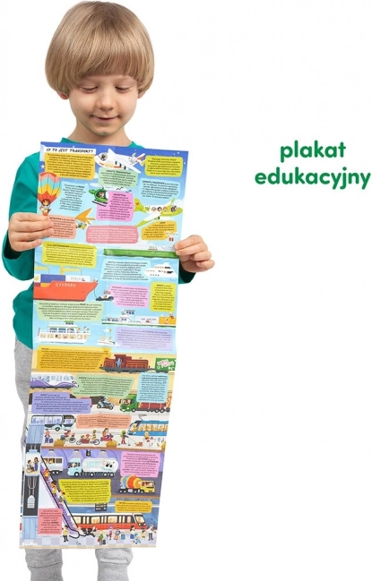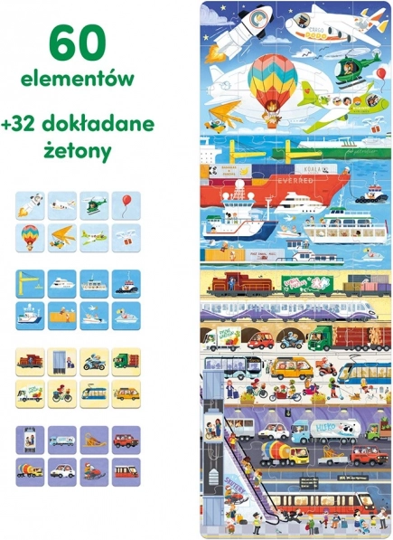 Veľké farebné puzzle má 60 dielikov a zobrazuje najrôznejšie dopravné prostriedky, ktoré prepravujú cestujúcich a tovar. Poznáš ich všetky? Na plagáte priloženom k skladačke nájdeš množstvo zaujímavostí o doprave a 32 obrázkov s prvkami na vyhľadávanie na ilustrácii umožní ešte viac kreatívnej zábavy. Sada je ideálnym vzdelávacím darčekom pre zvedavého predškoláka, najmä pre fanúšikov motorizmu.