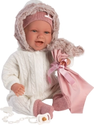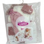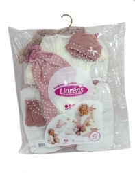 Štýlová sada pre bábiky NEW BORN veľkosti 40–42 cm zahŕňa 3-dielne oblečenie s ozdobným vreckovkou a mäkkú podložku s mašľou a popruhmi, ktorú možno použiť ako praktickú stoličku pre bábiku. Ručná výroba v Španielsku zaručuje kvalitu a detailné spracovanie – ideálny doplnok pre malé opatrovateľky od 3 rokov.