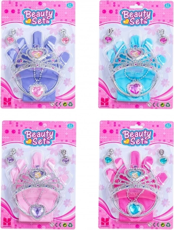Kúzelná sada doplnkov pre malé princezné obsahuje všetko, čo je potrebné na parádu: rukavičky, korunku (12,5 cm), čelenku, náhrdelník a náušnice. K dispozícii sú 4 farebné varianty – modrá, fialová, ružová a červená.