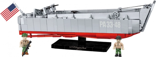 Loď meria približne 36 cm na dĺžku a ponúka bohatú výbavu: otvárateľnú čelnú rampu s lankovým mechanizmom, dva guľomety s ochranou, detailné kormidlo, pohon a kryt motorového priestoru. Dve figúrky – americký pešiak a námorník – dopĺňa obojstranne tlačená vlajka USA a elegantný stojan s názvom „LCVP Higgins Boat“.