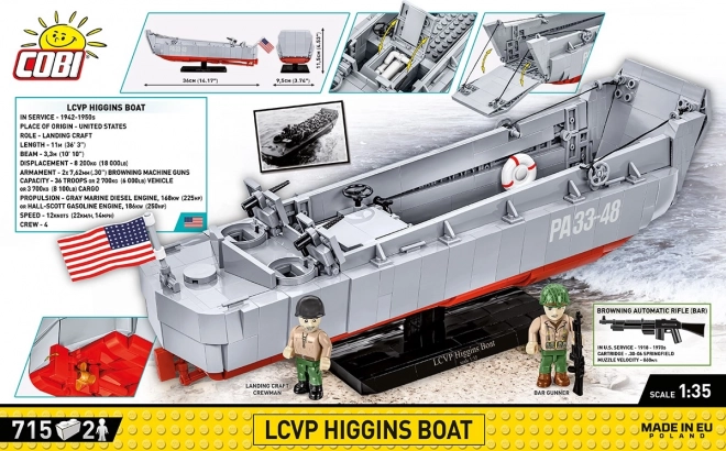 LCVP (Landing Craft, Vehicle, Personnel) od konštruktéra Andrewa Higginsa bola masovo nasadená pri operáciách D-Day, Torch, Husky, Shingle a Avalanche i v bojoch v Pacifiku. Stavebnica COBI je plne kompatibilná s ďalšími značkami stavebníc, spĺňa bezpečnostné normy a prichádza s prehľadným návodom.