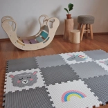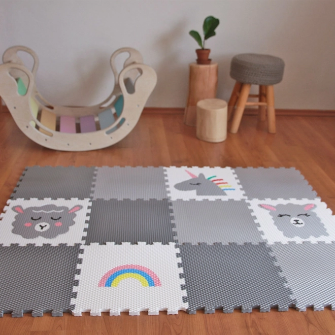 - 12 penových puzzle podložiek (4 sivé, 4 svetlosivé, 1 biela s lamou, 1 biela s baránkom, 1 biela s dúhou, 1 biela so svetlosivým jednorožcom)