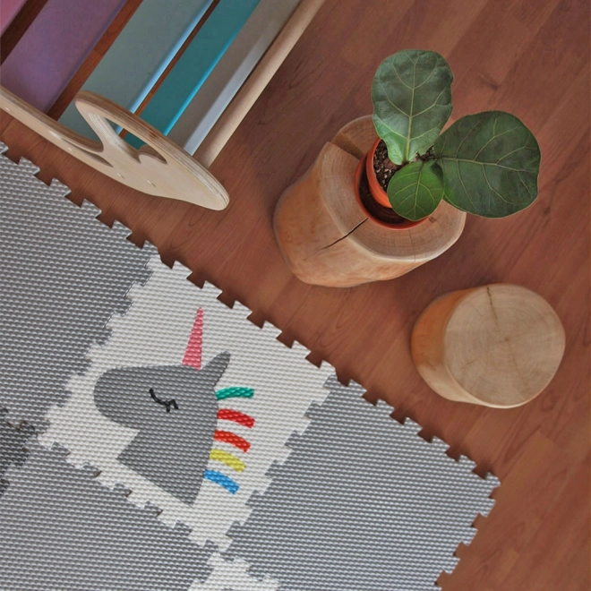 Vytvorte deťom bezpečný a pohodlný kútik s penovou podložkou z 12 dielov v motíve sivého jednorožca, dúhy a zvieratiek. Diely do seba pevne zapadajú vďaka zámkovému systému, podlaha je mäkká, izolačná a ľahko umývateľná. Materiál Vylen je certifikovaný, zdravotne nezávadný a vyrobený v ČR.