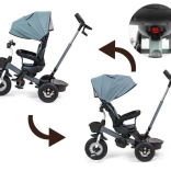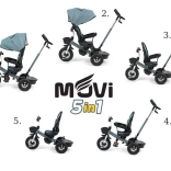 Trojkolka MOVI je stabilná a bezpečná, má moderný dizajn, pohodlné tvarované sedadlo otočné o 360 stupňov, ktoré umožní jazdu dopredu alebo dozadu. Koleso je vybavené zábranou proti vypadnutiu dieťaťa, trojbodovými bezpečnostnými pásmi a opierkami na nohy a nafukovacie kolesá zabezpečujú tichú a pohodlnú jazdu. Po odstránení rukoväti, zábradlia, striešky a poťahu sedadla je možné MOVI používať ako trojkolku. Vďaka funkcii voľnobehu môže dieťa voľne šliapať a na riadidlách pre rodiča možno ešte korigovať rýchlosť pohybu.