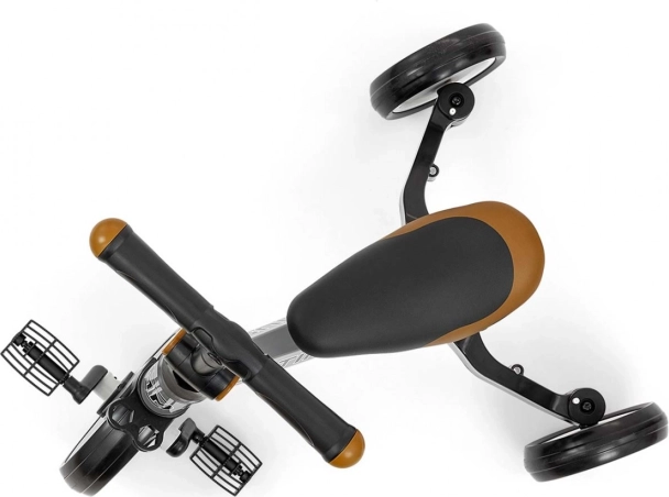 Kvalitné materiály a šikovne spracované detaily zaisťujú pohodlie aj odolnosť: oceľový rám, pohodlné ergonomické sedlo s výškovým nastavením, penové pneumatiky pre tichú jazdu a obmedzovač uhla riadenia proti pádu. Kompaktná konštrukcia uľahčuje transport aj skladovanie.
