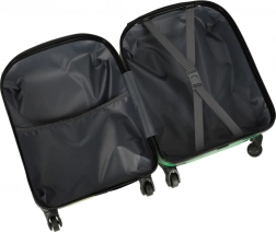 Vnútro je rozdelené na dve komory – jedna so sieťovaným vreckom a druhá s krížovými popruhmi na bezpečné zaistenie obsahu. Štyri otočné kolieska a výsuvná rukoväť umožnia deťom kufor ľahko viesť.