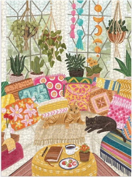Elegantné puzzle s motívom dvoch mačiek v raji ručne vyrábaných textílií a izbových rastlín je skvelou voľbou na pokojné chvíle aj ako originálny darček. Vďaka špičkovej tlači nezávadnými farbami a matnej povrchovej úprave vyniknú detaily aj farebná vernosť.