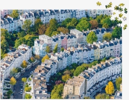 Letecký pohľad na Notting Hill prináša pôsobivú kompozíciu farieb a detailov, ktorá poteší pri skladaní aj na stene po dokončení.