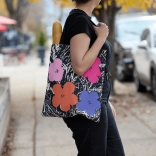 Toto taška zobrazuje slávny potlač kvetov od Andyho Warhola, čo jej dodáva umelecký nádych.