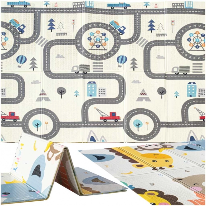 Táto veľká obojstranná podložka ponúka dva rôzne dizajny: jedno so zvieratami a druhé s mestským plánom, ktorý je skvelý na hranie s autíčkami. Farebný dizajn priláka pozornosť dieťaťa a podporí ho v hre na určitom mieste, čo rodičom uľahčí udržiavanie poriadku.