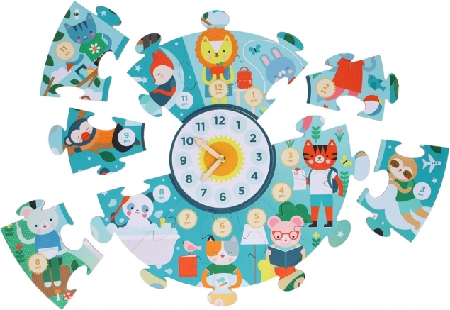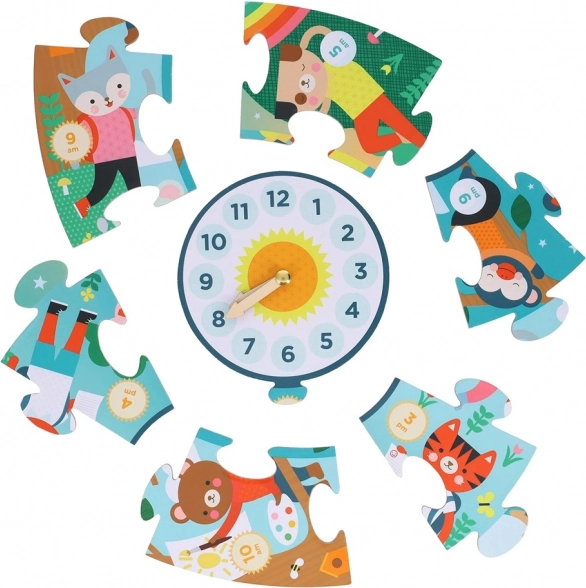 Uprostred puzzle je veľký ciferník s nastaviteľnými ručičkami. Deti si tak zábavne trénujú určovanie hodín aj minút a spoja hru s praktickým učením.