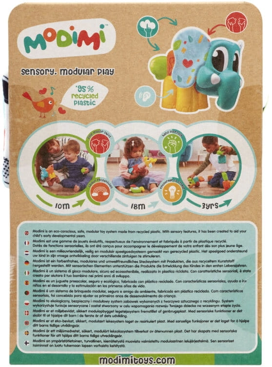 Objavte sloníča Ellie – milého spoločníka pre prvé objavovanie sveta zmyslov. Modulárny systém Modimi využíva senzorické prvky, ktoré rozvíjajú hmat, sluch a jemnú motoriku. Materiály z recyklovaného plastu zaručujú šetrnosť k prírode aj bezpečné hranie.