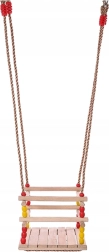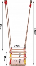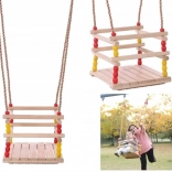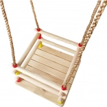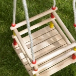 Táto drevená hojdačka so sedákom 30 × 30 cm a bezpečnostnou prednou zábranou je navrhnutá pre malé deti. Vďaka hladko brúsenému drevu je sedenie pohodlné a príjemné na dotyk. Po vhodnej impregnácii je vhodná do interiéru aj exteriéru – zavesíte ju na strom, pergolu alebo samostatnú konštrukciu.