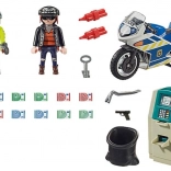 Akčná sada PLAYMOBIL z rady City Action prináša napínavú naháňačku v meste: policajt na motorke prenasleduje vreckového zlodeja, ktorý vylomil bankomat. V balení nájdete 2 figúrky, motorku, bankomat, železnú páku, vak na korisť a bankovky – všetko pre realistické mestské dobrodružstvo.