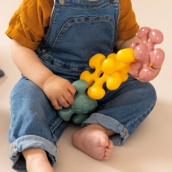 Rôzne textúry a farby tejto hračky prinášajú zábavný spôsob, ako rozvíjať zmysly a motoriku dieťaťa. Tieto pomáhajú v prvých krokoch poznávania sveta.