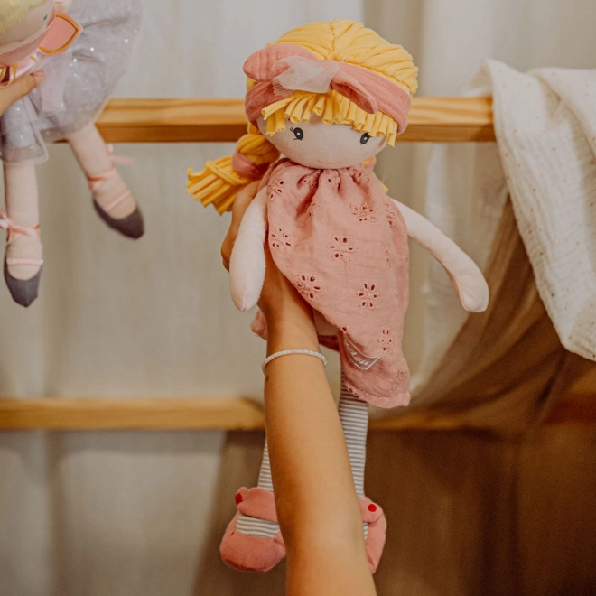 Bábika Suzette v ružových bavlnených šatách s jemnými kvetinovými výšivkami, balerínkami a čelenkou s mašľou podnecuje detskú fantáziu a nežné hranie. Vďaka mäkkému prevedeniu je vhodná ako prvá bábika pre bábätká aj batoľatá.